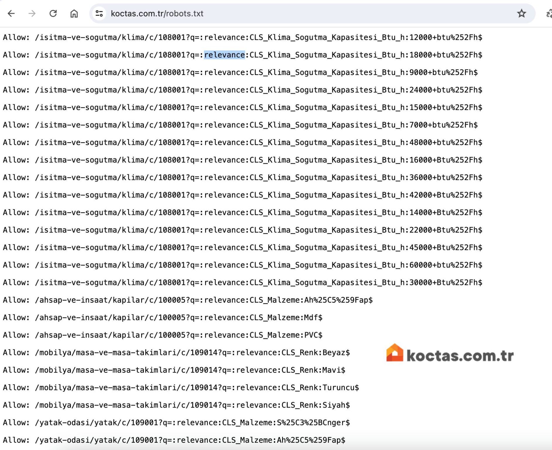 📌 500 KiB robots.txt dosya boyutu sınırına ulaşabilir, (aynı sonuçlanacak satırları birleştirerek azaltabilirsiniz örn: Allow: /*?q=:relevance: taraması istenen URL’lerdeki parametre belirterek tek satırda komut verilebilir. )