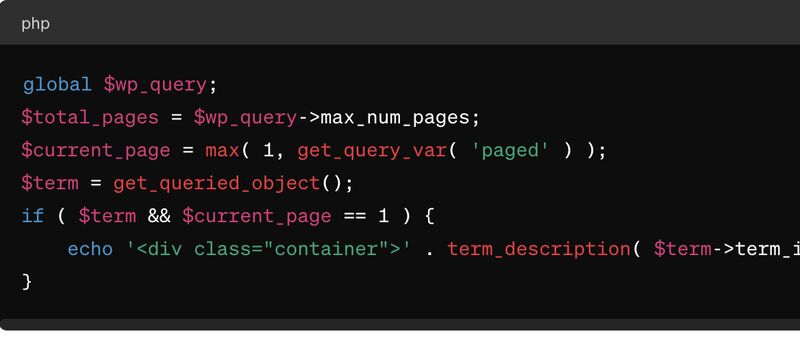 echo ‘<div class=”container”>’ . term_description( $term->term_id, ‘product_cat’ ) . ‘</div>’;